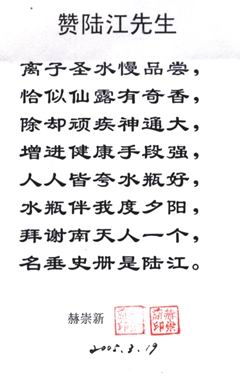 3. 詳細(xì)了解請上網(wǎng),可見臨床報(bào)告,鑒定證書、專家評說、治病機(jī)理、用戶反饋、題詞、詩歌、錦旗等彩色掃描件,被譽(yù)為"神奇水瓶"。