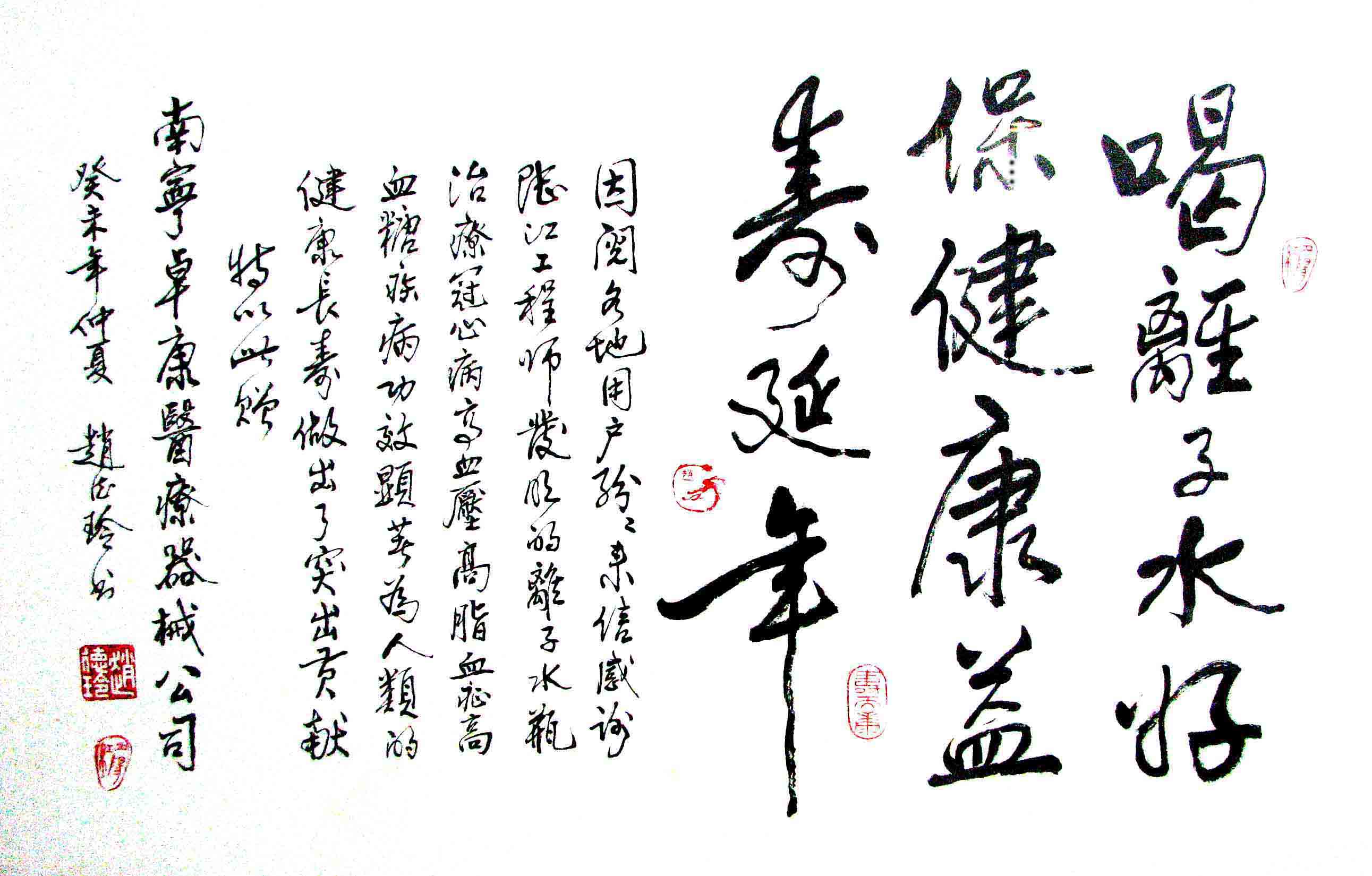- -----南寧卓康微小水科技有限公司原為南寧卓康醫(yī)療器械有限責(zé)任公司 ,用戶普遍反饋高血壓患者飲用2—5個(gè)月,癥狀消除,不再服藥,治愈了高血壓; 冠心病患者,包括已做和未做支架或搭撟手術(shù)者,經(jīng)3—5個(gè)月飲用,消除心痛、胸悶、早搏、房顫和心絞痛等癥狀,逆轉(zhuǎn)至消除動(dòng)脈粥樣硬化和斑塊,一年左右治愈冠心病,心腦電圖正常,經(jīng)冠脈造影掃描無明顯狹窄,表明冠心病痊愈;糖尿病人飲用3-10個(gè)月,血糖尿糖正常,治愈2型糖尿病; 并且使前列腺增生、低血壓、腦萎慢性咽喉炎、慢性氣管炎、支氣管炎、哮喘、矽肺病、甲亢、慢性胃腸炎、膽囊炎、慢性腎炎、腎衰、風(fēng)濕性關(guān)節(jié)炎、痔瘡和濕疹皮炎及中風(fēng)癱瘓或偏癱失語后遺癥等不藥而愈,且多病同治,無需終生服藥,彌補(bǔ)了幾千年來藥物的欠缺,使“微小水”成為人類消除高血壓、冠心病和糖尿病的寶貴資源。腦動(dòng)脈粥樣硬化、低血壓和前列腺增生患者,一般飲用四個(gè)月痊愈;中風(fēng)后遺癥患者,一般飲用8個(gè)月痊愈。請?jiān)旈啞队脩舴答仭窓谀恐写罅炕颊叩姆答佇拧z測報(bào)告,有的還附照片。產(chǎn)品屢獲大獎(jiǎng),論文也屢獲一等獎(jiǎng)。廣大用戶好評不斷,有口皆碑。