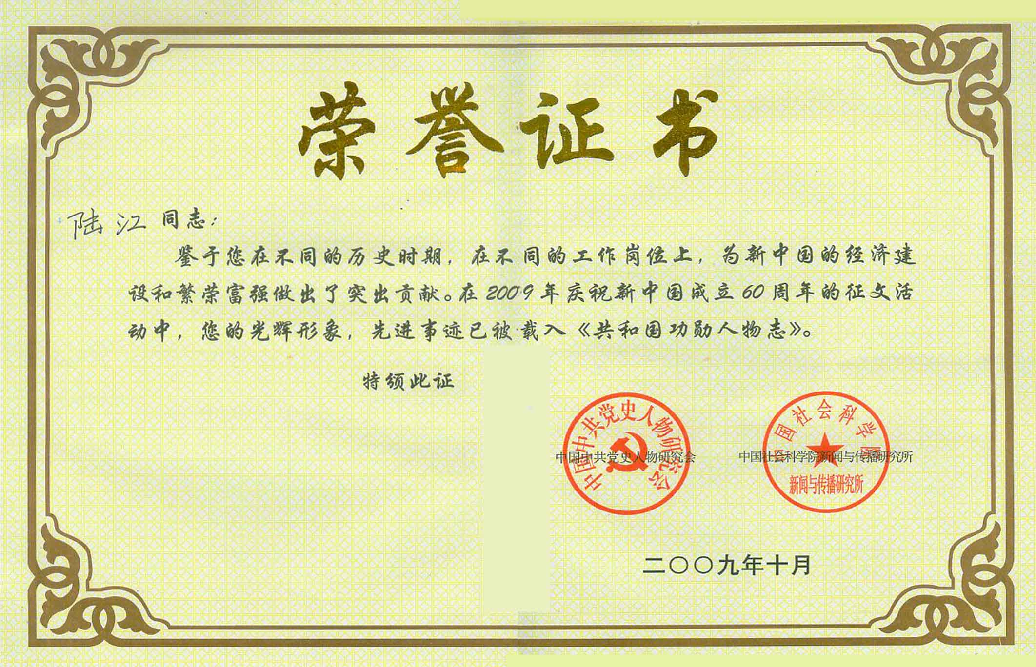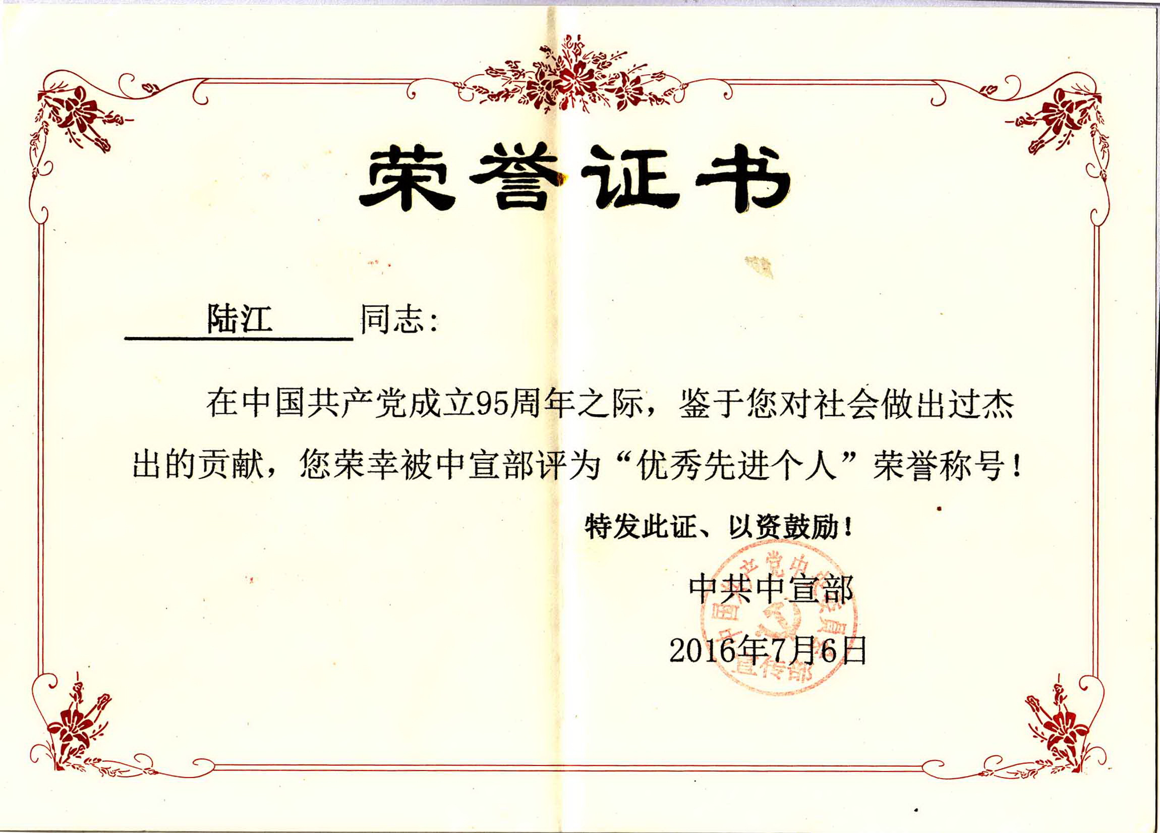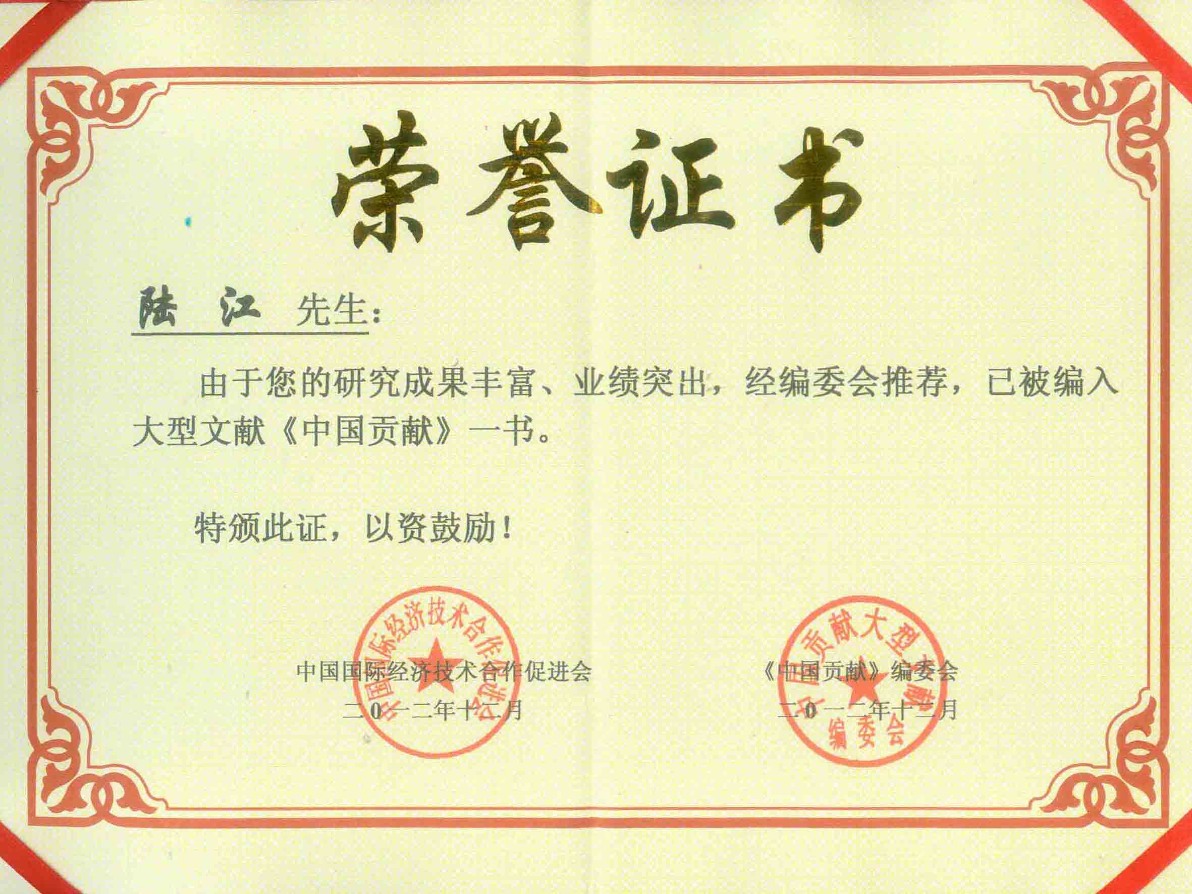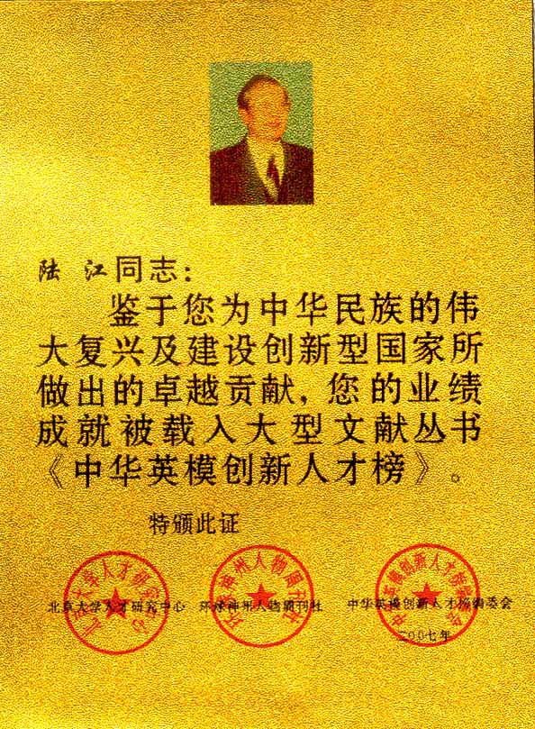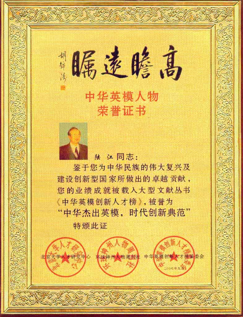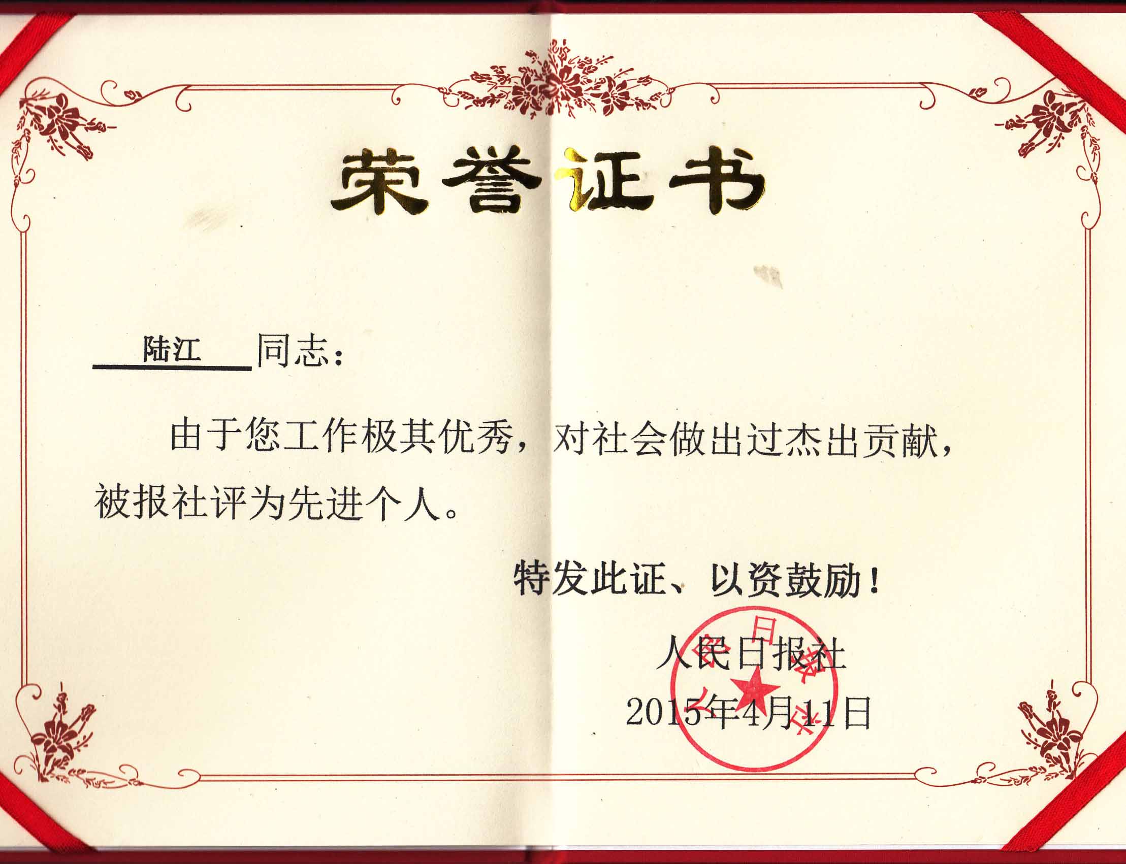 陸江的杰出貢獻(xiàn)被人民日報(bào)社評為先進(jìn)個(gè)人