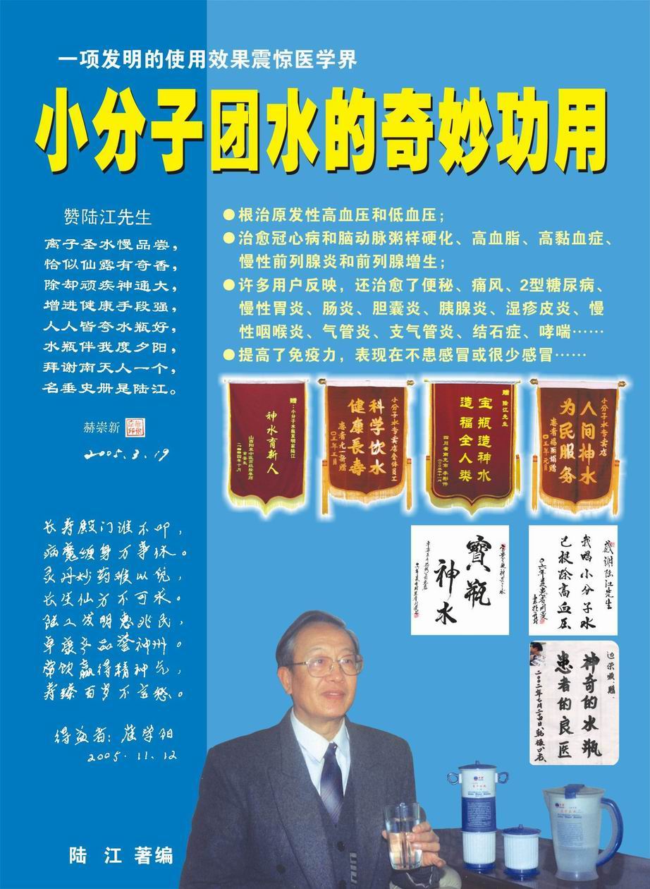 人類幾千年來患以上病癥需終生服藥,幾十年也不能治愈。可是我國南寧的高級工程師陸 江,于1990年想根治高血壓,研究發(fā)明了離子水瓶,處理出微小分子團(tuán)水供飲用,經(jīng)過醫(yī)院臨床試用和專家鑒定,1999年獲中國發(fā)明專利權(quán),產(chǎn)品于2000年投放市場后一直跟蹤調(diào)查,據(jù)全國各地用戶反饋:祛除了高低血壓、糖尿病和冠心病,并使前列腺增生、咽喉炎、鼻竇炎、慢性氣管炎、支氣管炎、矽肺病、哮喘、慢性胃炎、腸炎、慢性膽囊炎、慢性腎炎、腎衰、膀胱炎、便秘、痔瘡、風(fēng)濕性關(guān)節(jié)炎和濕疹皮炎及中風(fēng)后遺癥等病癥不藥而愈。為什么喝微小水能治20多種病?陸 江從1991年德國科學(xué)家發(fā)現(xiàn)細(xì)胞膜水通道僅為2納米獲得啟發(fā),認(rèn)為多種器官患病是因細(xì)胞脫水,不能正常代謝和分裂增殖,才使器官細(xì)胞減少致衰弱萎縮而形成細(xì)胞缺水性病癥。22年來的實(shí)踐有力地支持了“細(xì)胞脫水致病”這一重要論點(diǎn),表明喝微小水可滿足細(xì)胞的生理需求,補(bǔ)水就能祛病,是生命科學(xué)新亮點(diǎn)。