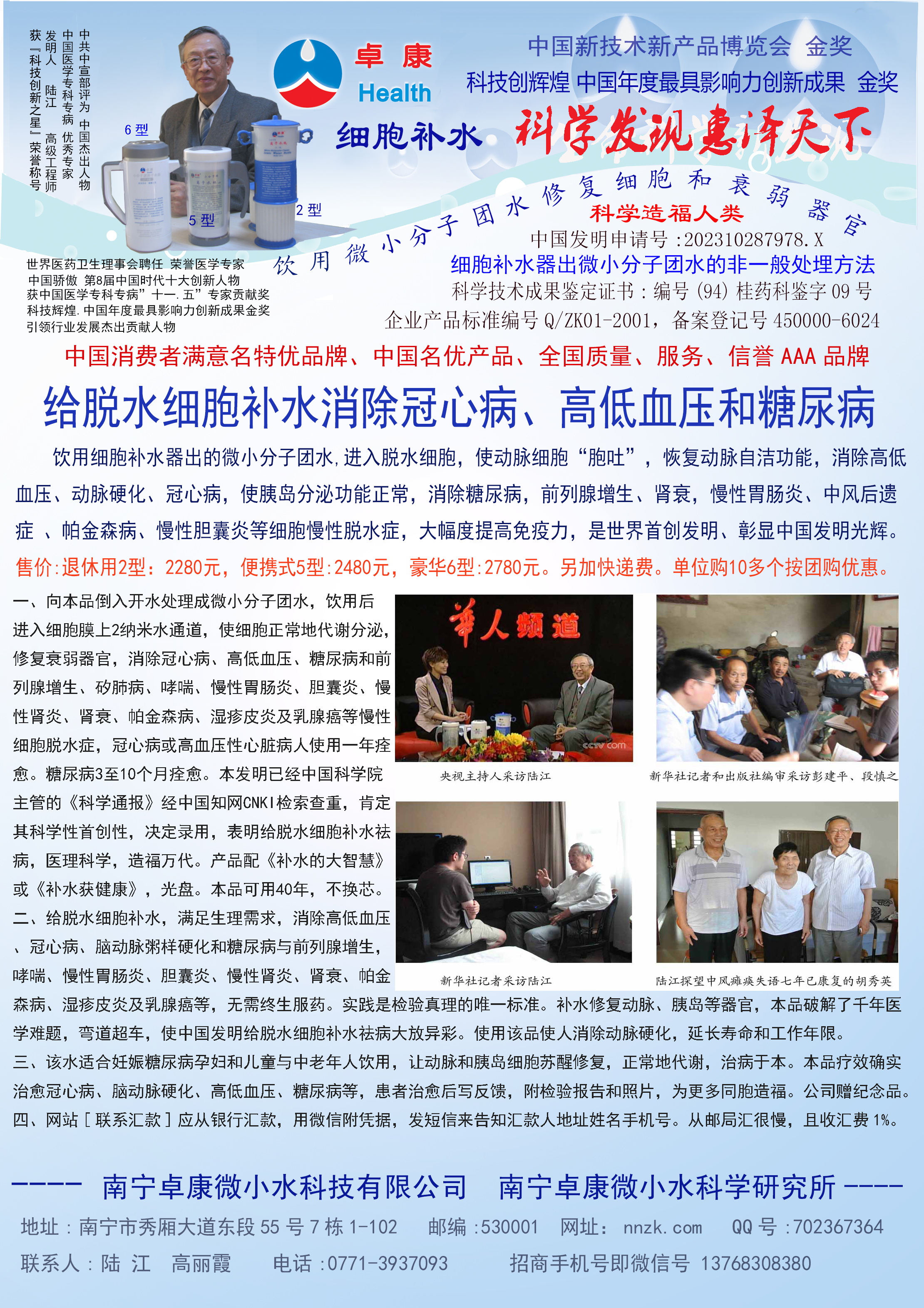 -----我是從事建筑的高工,本來沒有資格去攻克醫(yī)學(xué)難題,卻為了自身健康才扣響醫(yī)學(xué)的大門。由于我1990年患高血壓,因怕中風(fēng)才研究發(fā)明了離子水瓶,我把水處理成微小分子團(tuán)水,飲用后治愈了高血壓。便于1993年底送到三家省級醫(yī)院做臨床試用4個(gè)月。經(jīng)北京和廣西醫(yī)學(xué)專家鑒定:"降脂降壓效果好"," 能擴(kuò)大心腦動(dòng)脈流量,改善心腦電圖以及微循環(huán)","對治療心腦動(dòng)脈粥樣硬化、高血壓、高血脂有良好的醫(yī)療保健作用。""產(chǎn)品的技術(shù)性能和療效達(dá)到了同類產(chǎn)品的國內(nèi)領(lǐng)先水平,經(jīng)廣西醫(yī)學(xué)科學(xué)情報(bào)研究所檢索,未見國外有類似報(bào)道。"中國醫(yī)學(xué)科學(xué)院張正國教授從美國國立醫(yī)學(xué)圖書館數(shù)據(jù)庫存Medline檢索英俄文資料,均未見類似報(bào)告。2000年上市后,我為了對消費(fèi)者負(fù)責(zé)而繼續(xù)觀察研究,一直通過《信譽(yù)卡》和《質(zhì)量跟蹤調(diào)查書》向患者承諾療效,請用戶使用6個(gè)月后反饋效果。和脂壓患者飲用2至5個(gè)月內(nèi),消除癥狀,停服藥物,血壓正常;冠心病患者飲用3~5個(gè)月逐漸減輕至消除心絞痛、房顫等癥狀,不再服藥,飲用1年左右心電圖正常,經(jīng)冠脈造影掃描無明顯狹窄,表明冠心病痊愈。大量患者還反映許多衰弱器官被修復(fù),讓前列腺增生、慢性咽喉炎、慢性氣管炎、支氣管炎、慢性胃炎、腸炎和膽囊炎等不藥而愈;2型糖尿病患者是因?yàn)橐葝u衰弱致病,飲用該水半年至一年,逐漸減藥至停藥,血糖尿糖正常,真正治愈2型糖尿病。中風(fēng)后遺癥患者飲用六七個(gè)月,可逐漸減輕至消除肢體和語言障礙,表明飲用該水能讓壽命很長的神經(jīng)元細(xì)胞逐漸修復(fù),奇跡般地恢復(fù)肢體和語言功能。飲用后還使胸腺和脾臟兩個(gè)重要的免疫器官被修復(fù)和增強(qiáng),產(chǎn)生免疫細(xì)胞多,提高了免疫力,使人不生病或少生病。自此, 飲用微小分子團(tuán)水創(chuàng)造了攻克冠心病、高(低)血壓和糖尿病三大醫(yī)學(xué)難題的奇跡。人們對此感到不可思議,但實(shí)踐是檢驗(yàn)真理的唯一標(biāo)準(zhǔn)。